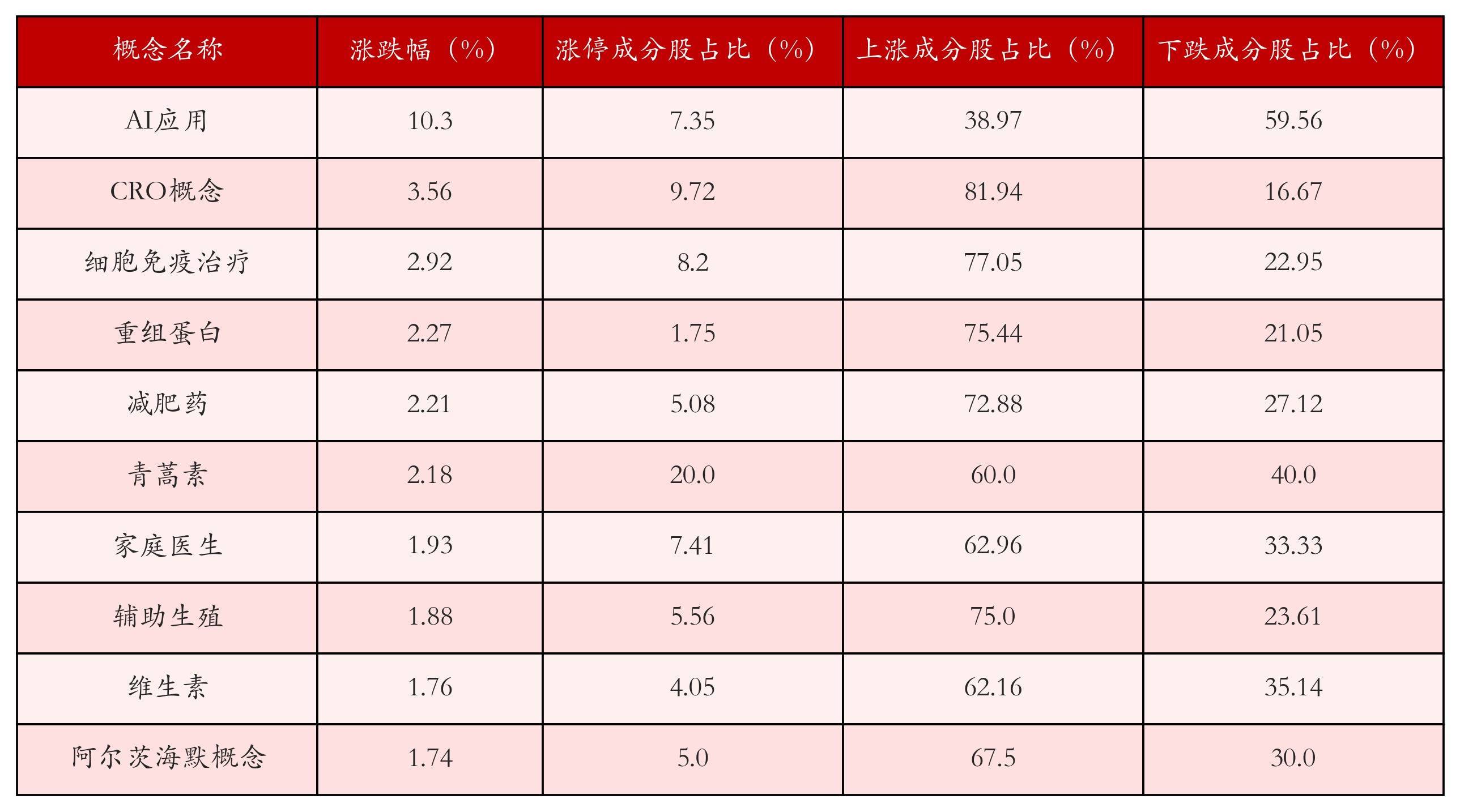 根据A股概念涨跌幅与所对应的股票池综合分析,涨幅靠前的三个概念板块分别为:AI应用、CRO概念与细胞免疫治疗。排名前10位的概念板块相关数据见下表:
