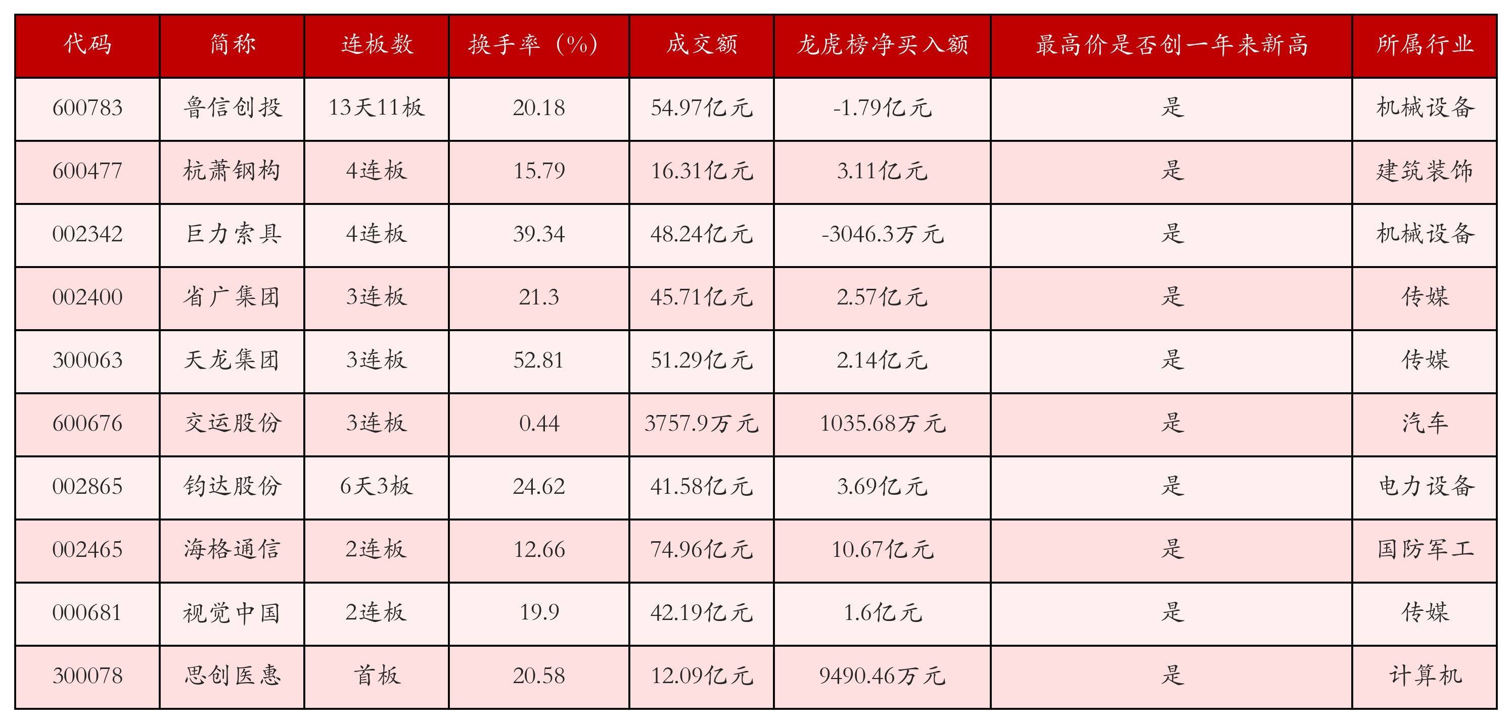 截至1月13日收盘,上证综指下跌0.64%,收于4138.76点,深证成指下跌1.37%,收于14169.4点,创业板指下跌1.96%,收于3321.89点。今日沪深两市A股共计75只涨停,综合当前连板数以及当日龙虎榜数据,其中较为强势的前三只个股分别为:鲁信创投(600783)、杭萧钢构(600477)与巨力索具(002342)。今日强势个股前10位具体数据见下表: