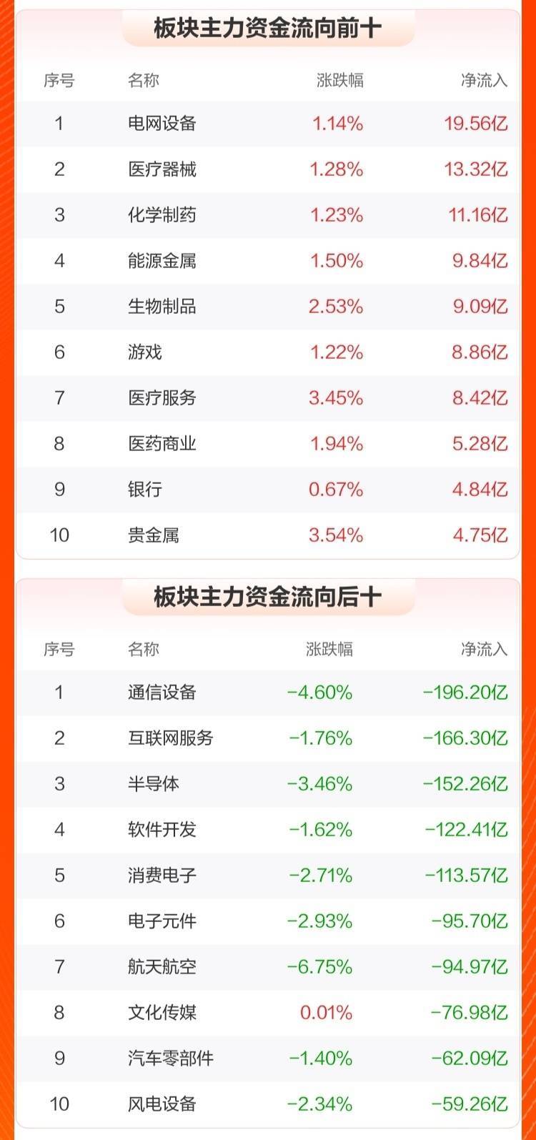 r个股表现上,市场分化特征明显,全市场上涨股票数量超过1600只,逾70只股票涨停,同时超3700只个股下跌。资金流向显示,医疗器械、化学制药等板块净流入排名靠前,而互联网服务、半导体等板块净流出居前,资金正从高位题材向具备基本面支撑的领域转移。