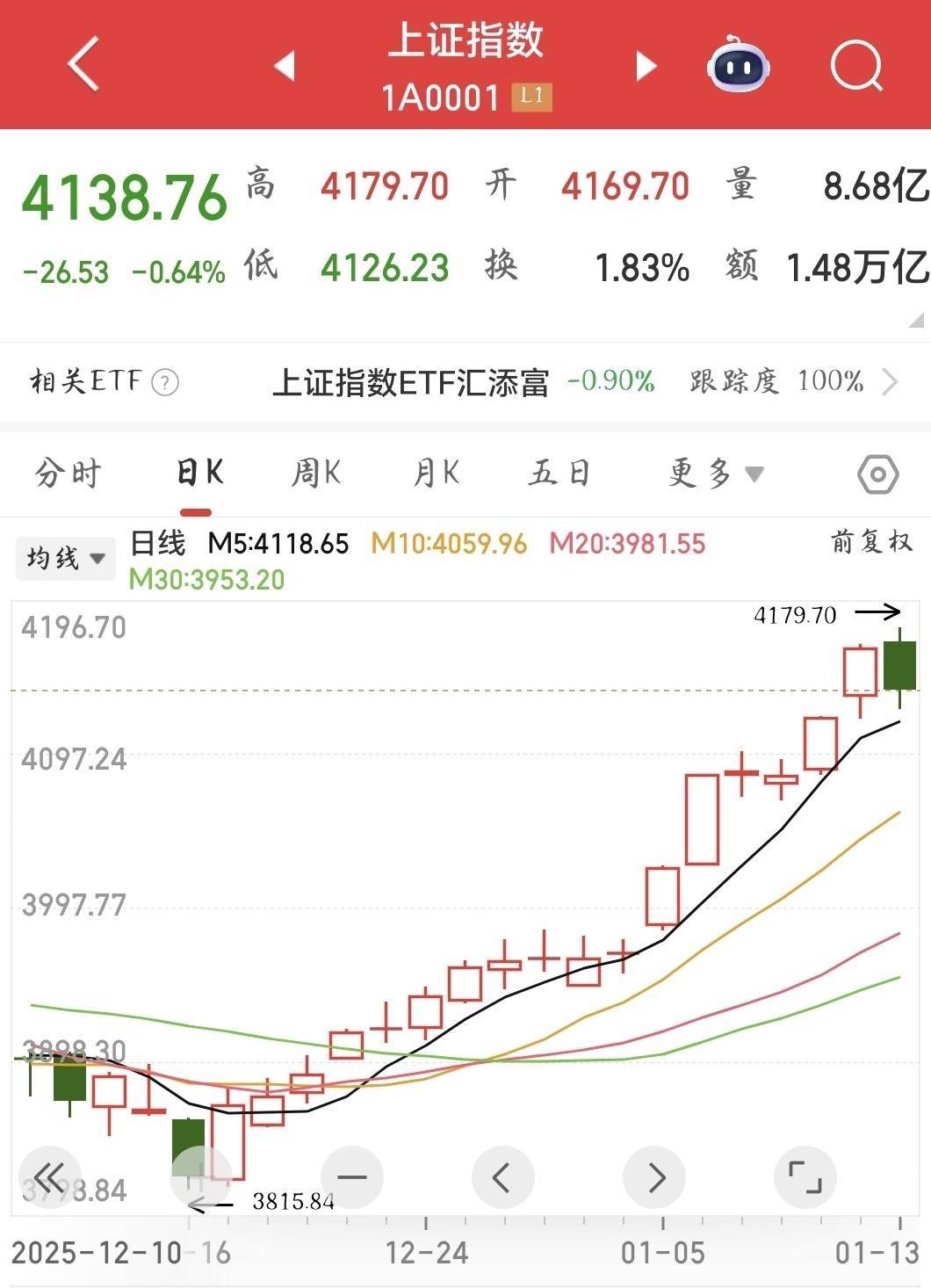 r1月13日,A股连续上涨势头迎来调整,上证指数终结此前的17连阳,三大指数集体收跌。与此同时,市场交投活跃度持续攀升,沪深京三市成交额突破3.69万亿元,较昨日放量541亿元,再创历史天量,多空博弈程度激烈。